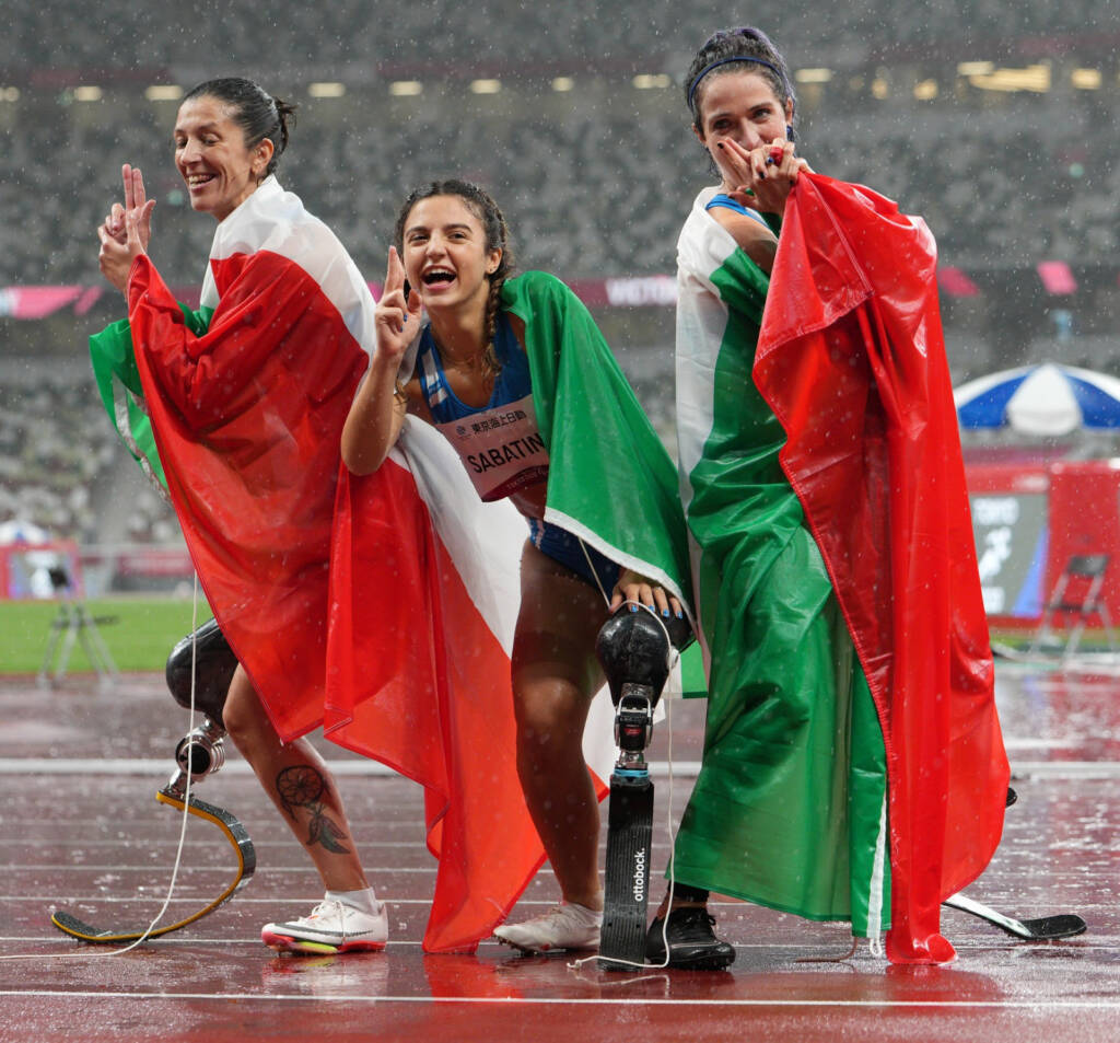 FOTO Bizzi/Comitato Italiano Paralimpico: Monica Contrafatto, Ambra Sabatini celebrano sotto la pioggia la storica tripletta di Tokyo; Sabatini con il tabellone che indica il proprio record del mondo.